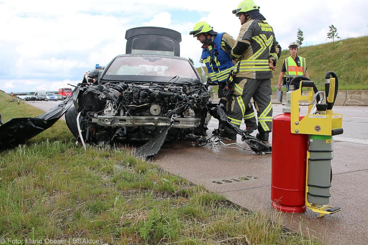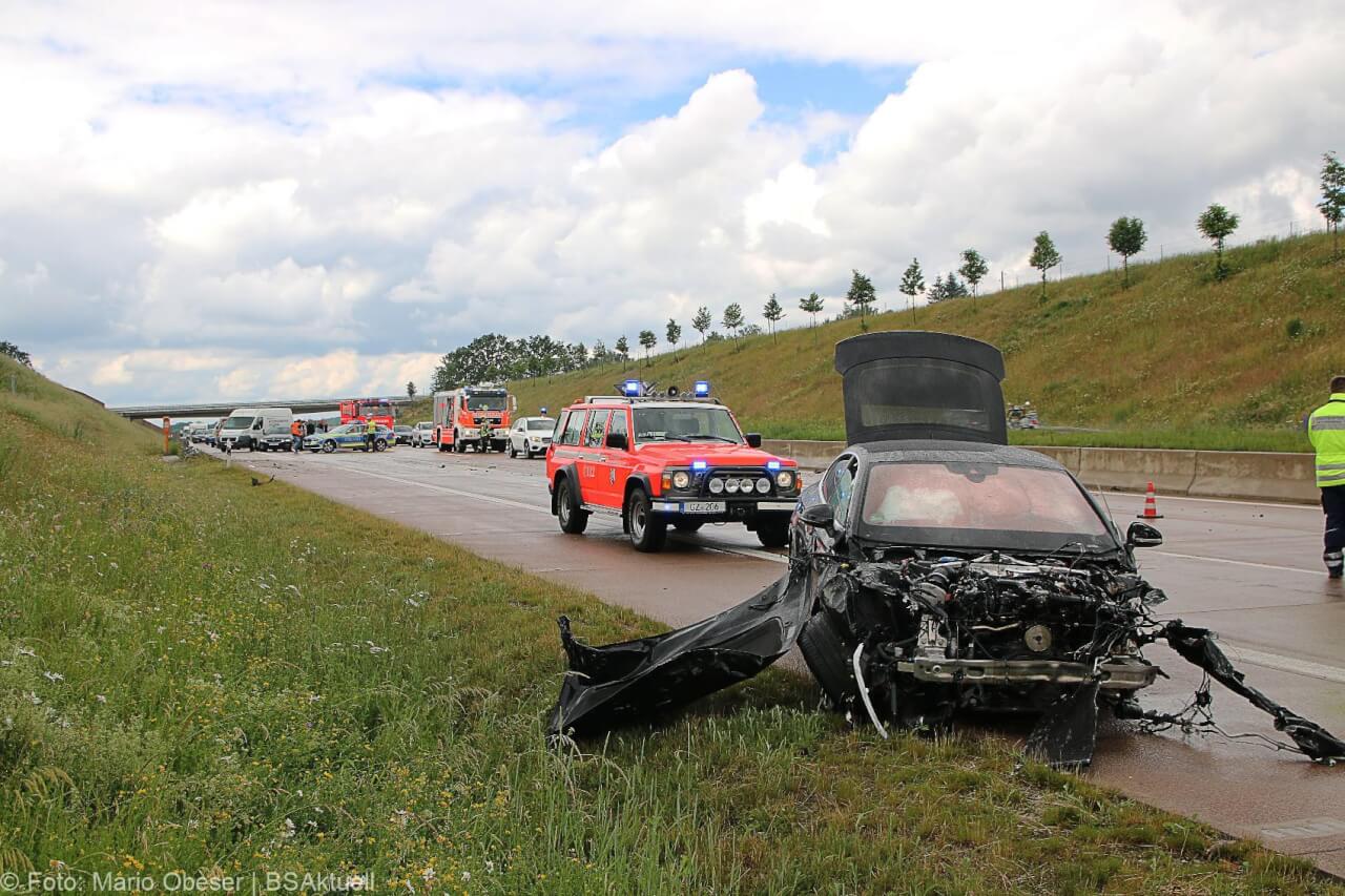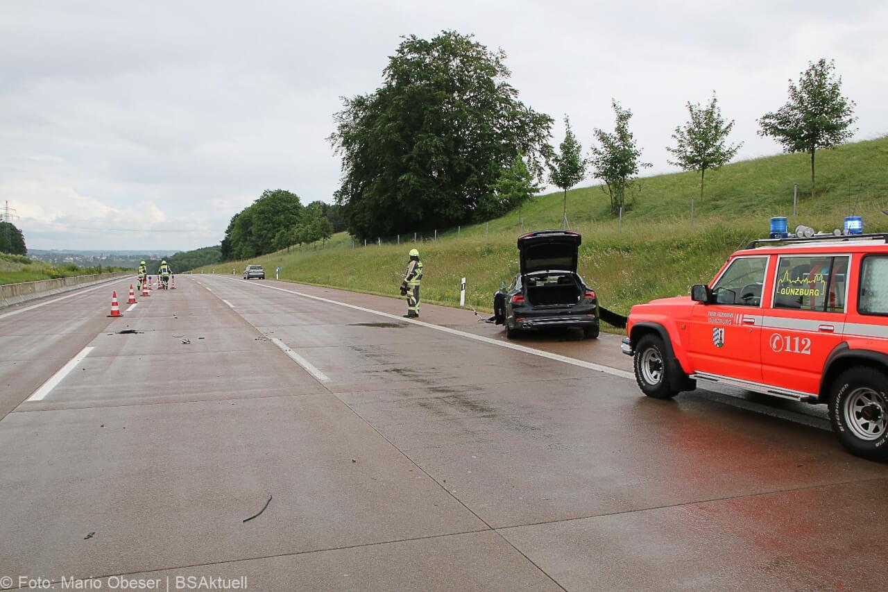 Über die komplette Fahrbahn lagen auf über 50 Metern verteilt Fahrzeugteile herum. Nach der Autobahnpolizei übernahm die alarmierte Feuerwehr Günzburg die Komplettsperrung der Richtungsfahrbahn in Fahrtrichtung München. Im weiteren Verlauf wurden dann der Verkehr an der Unfallstelle vorbeigeleitet und die Feuerwehr vom Autobahnbetreiber Pansuevia abgelöst. Der Rückstau reichte bis etwa sechs Kilometer zurück. Der Rettungsdienst kümmerte sich um die Verletzte, die allein in ihrem Pkw unterwegs war.
