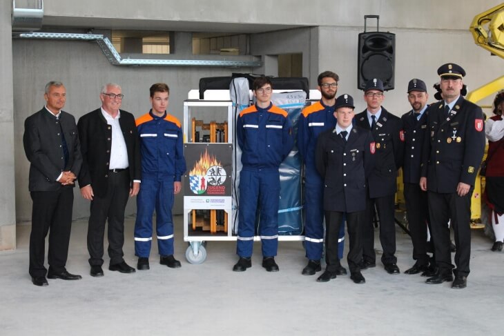 Ferdinand Munk von der Günzburger Steigtechnik übergab an die Jugendgruppe der Feuerwehr Günzburg einen Rollcontainer für die Nachwuchswerbung. Auf diesem Container sind Flyer, Tische, Bänke, Beamer, Leinwand und Roll-Ups untergebracht.