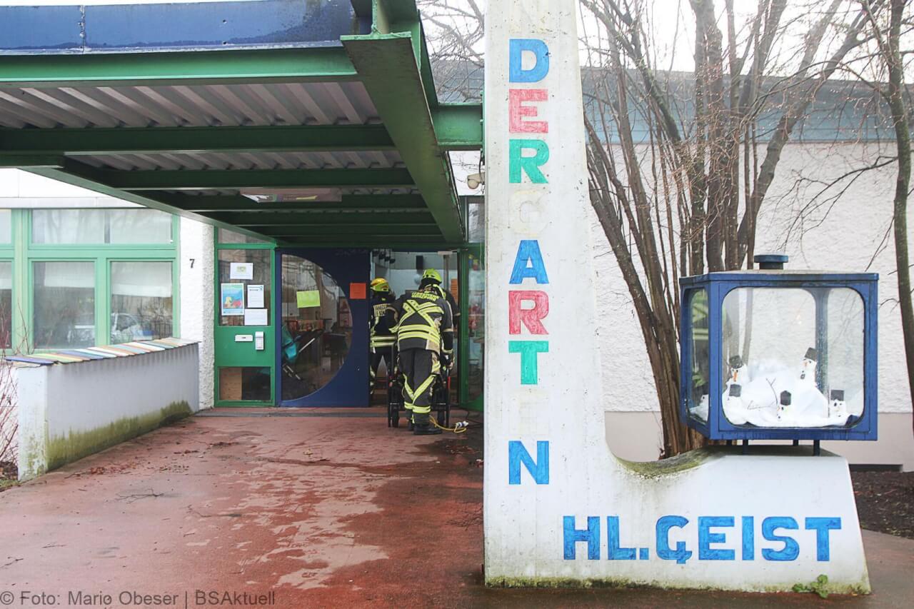 Hintergrund war ein möglicher Gasaustritt, nachdem es einer Angestellten im Keller des Gebäudes kurzzeitig schwindlig geworden war. Die Feuerwehr brachte rund 90 Kinder und 10 Kindergärtnerinnen aus dem Kindergarten in den in den angrenzenden Garten in Sicherheit. Auch mussten aus dem angebauten Gebäude wurden zwei Personen ihre Wohnung verlassen. Nach Messungen und der Nachschau konnten die Einsatzkräfte schnell Entwarnung geben. Die Messungen konnten keinen Austritt von Gas bestätigen. Nachdem mit einem Drucklüfter die Räumlichkeiten belüftet wurden, konnten alle gegen 12.00 Uhr wieder zurück ins Gebäude.