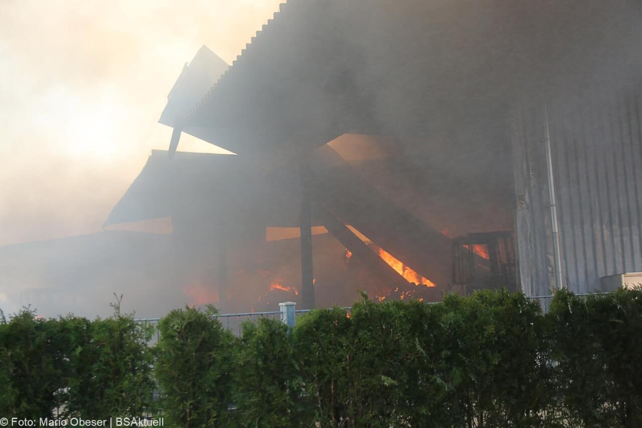 Eine etwa 36 x 20m große Lagerhalle, in der eine größere Menge Stroh, landwirtschaftliche Fahrzeuge und Geräte, Dieseltanks, Reifen und Weiteres lagerte, brannte in voller Ausdehnung. Die tiefschwarze Rauchsäule war viele Kilometer weit zu sehen. Ein Augenzeuge konnte diese im rund 20 Kilometer entfernten Thannhausen noch deutlich erkennen.