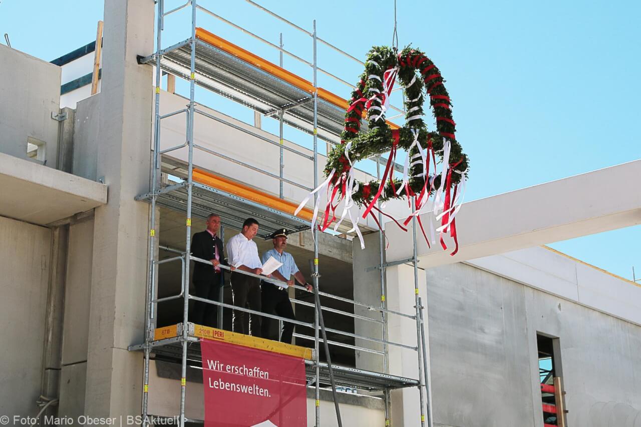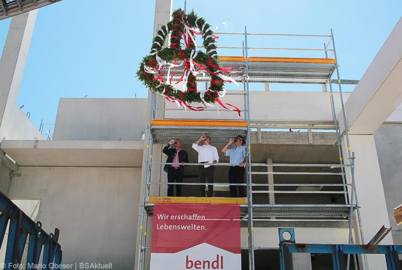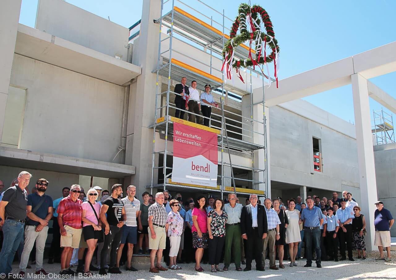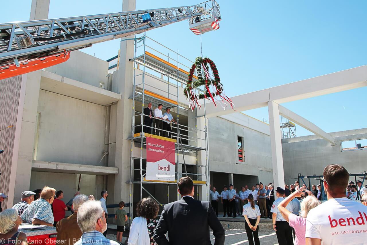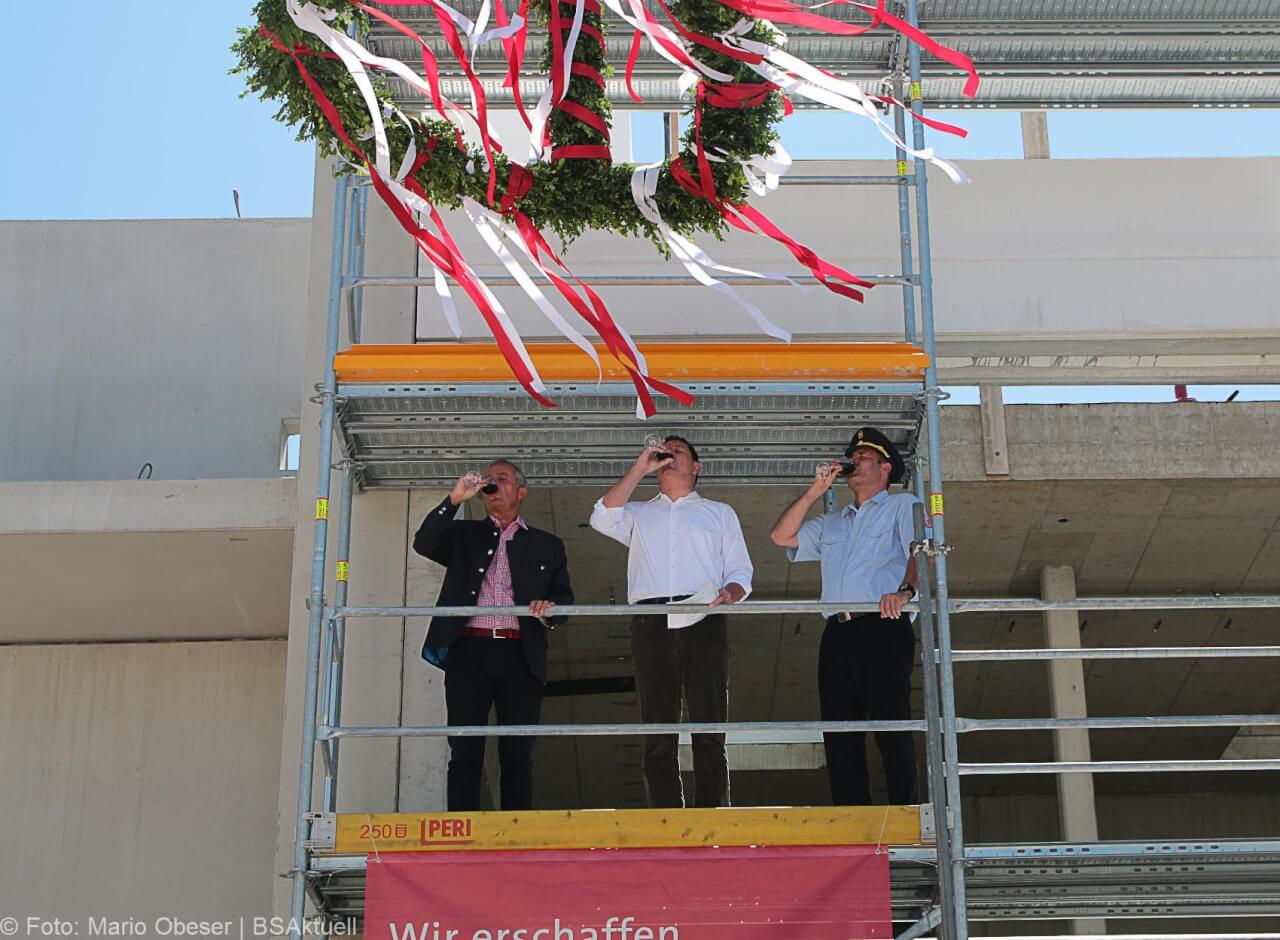 Die ersten Planungen zu dem rund neun Millionen Euro Bau begannen bereits im Jahr 2005, weiß der Vereinsvorsitzende und Oberbürgermeister Gerhard Jauernig zu berichten. Nun ist der erste Bauabschnitt abgeschlossen. Dies wurde mit dem Richtfest am gestrigen Freitag gefeiert. Der Oberbürgermeister Gerhard Jauernig, Geschäftsführer der Firma Bendl Stefan Wiedemann und Stadtbrandinspektor und 1.Kommandand der Freiwilligen Feuerwehr Günzburg Christian Eisele versammelten sich im Obergeschoß des Rohbaues, der langsam Form annimmt. Der Richtbaum wurde von der Drehleiter getragen.