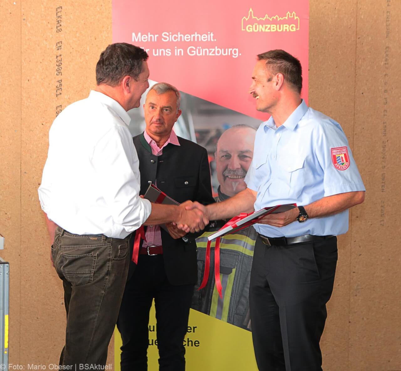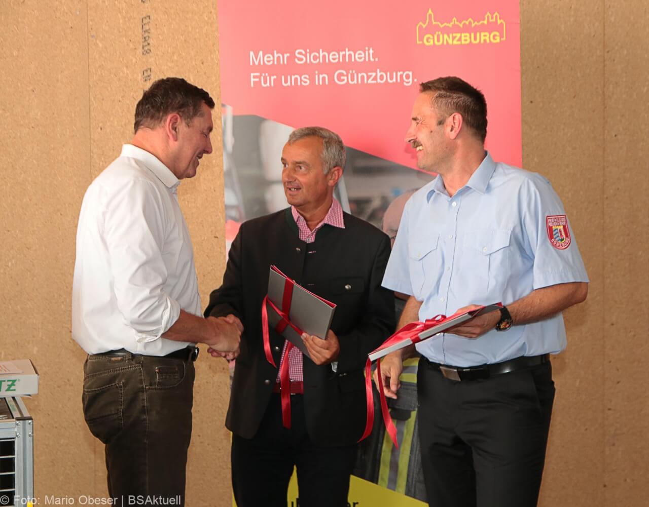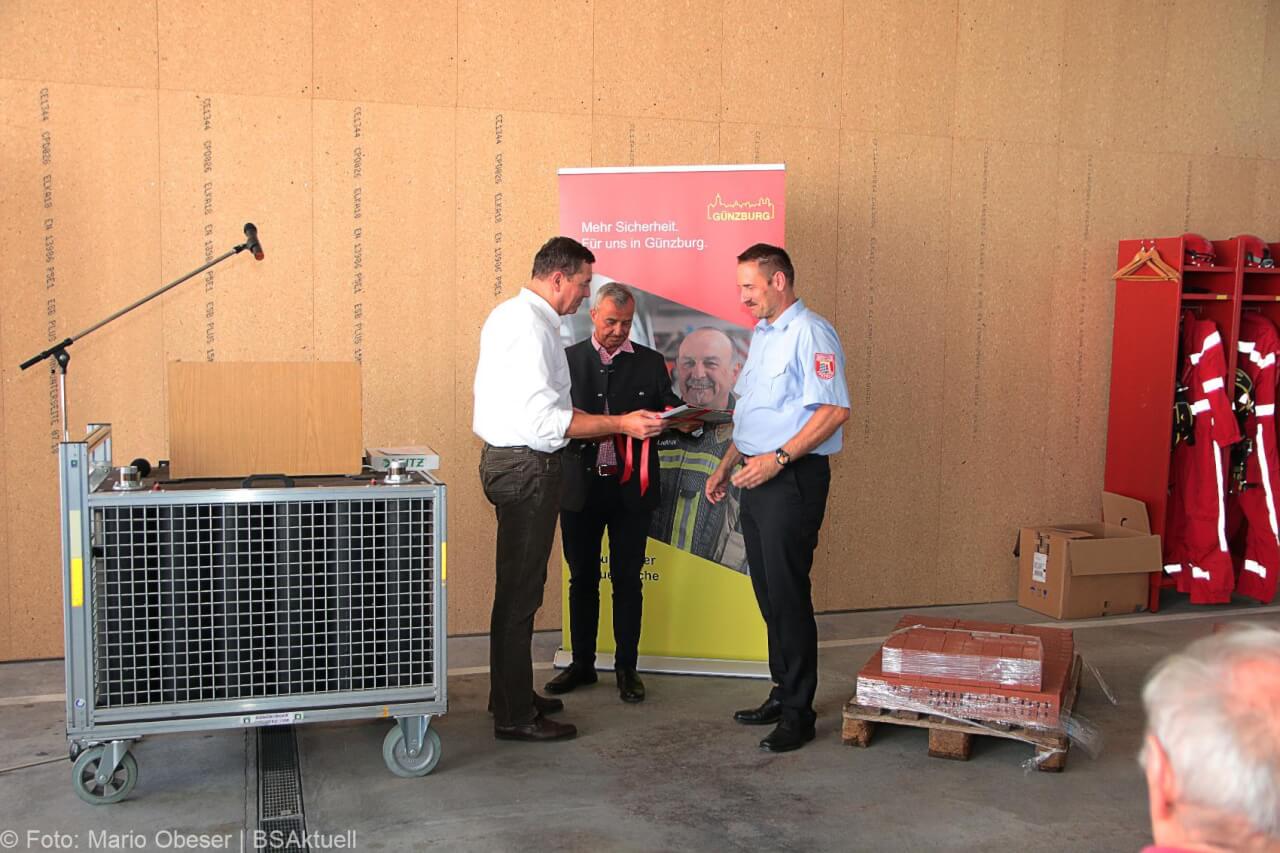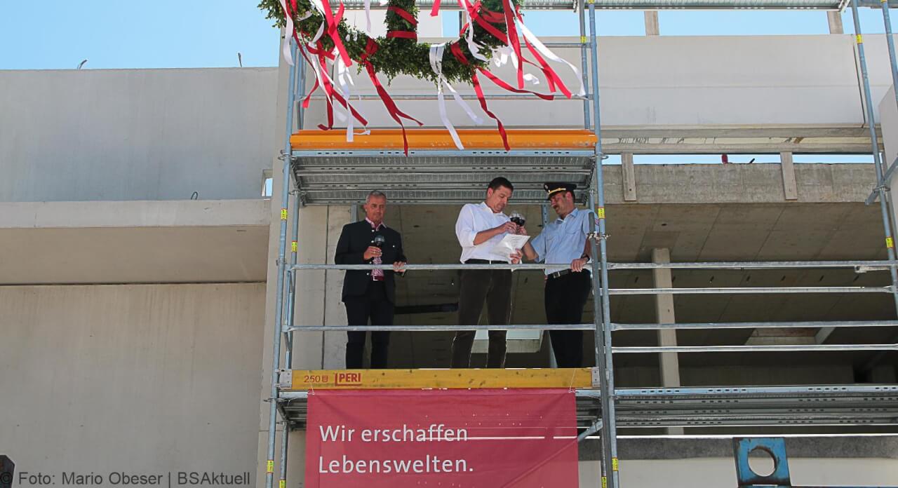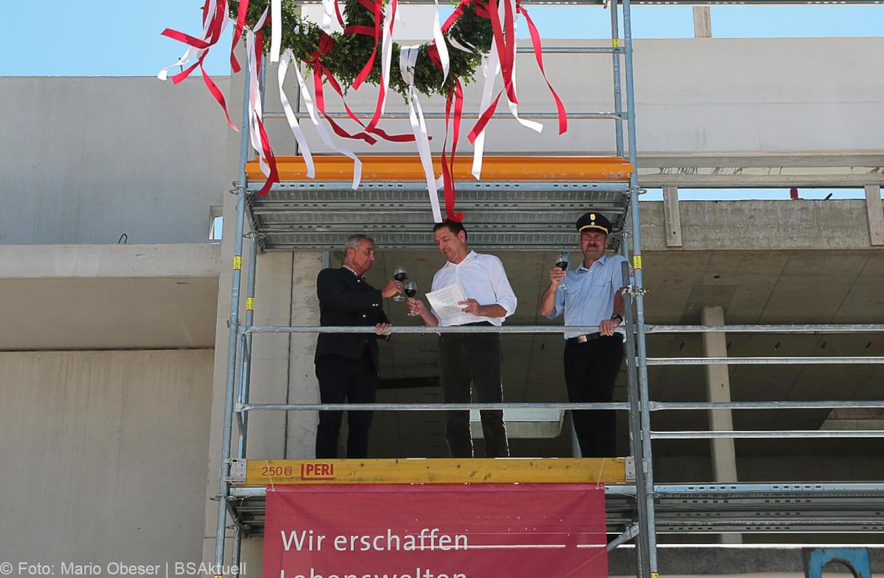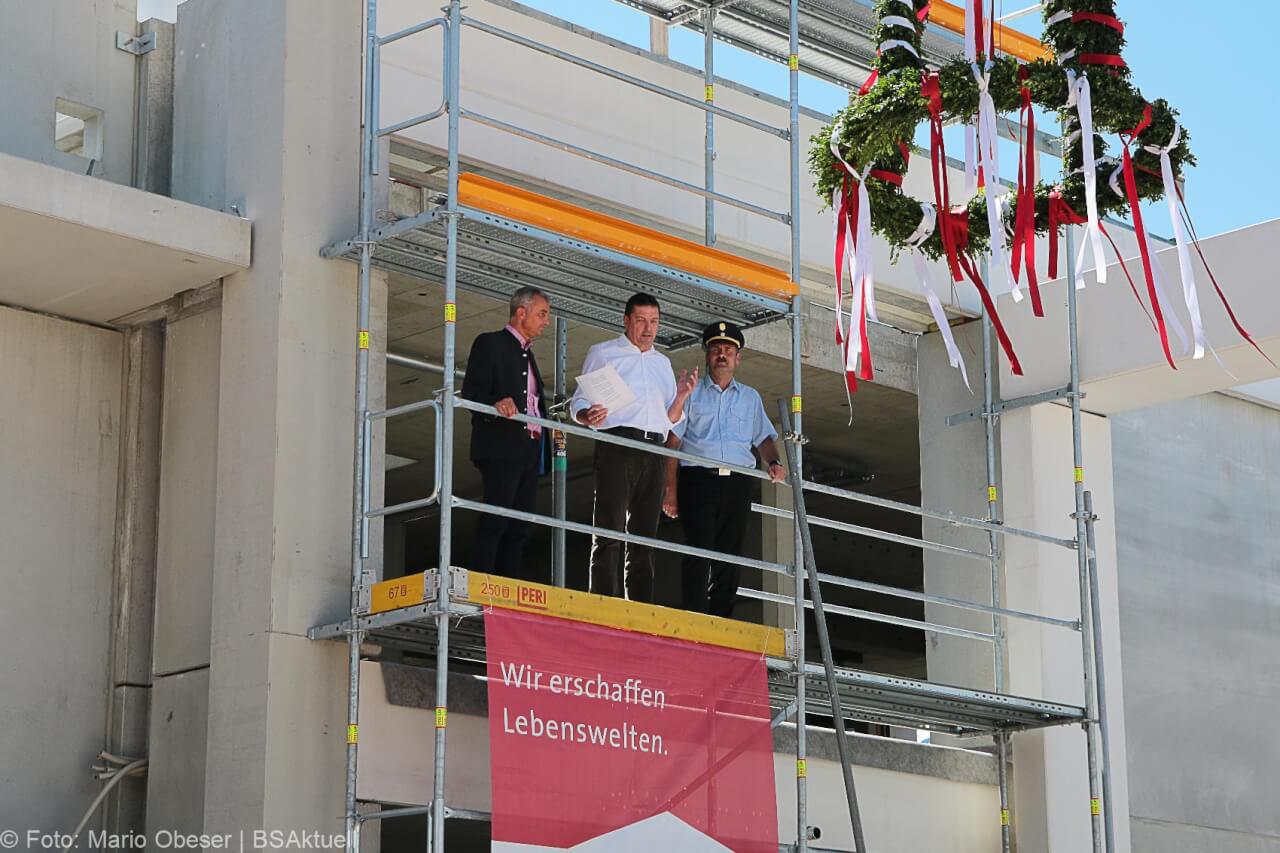 Die ersten Planungen zu dem rund neun Millionen Euro Bau begannen bereits im Jahr 2005, weiß der Vereinsvorsitzende und Oberbürgermeister Gerhard Jauernig zu berichten. Nun ist der erste Bauabschnitt abgeschlossen. Dies wurde mit dem Richtfest am gestrigen Freitag gefeiert. Der Oberbürgermeister Gerhard Jauernig, Geschäftsführer der Firma Bendl Stefan Wiedemann und Stadtbrandinspektor und 1.Kommandand der Freiwilligen Feuerwehr Günzburg Christian Eisele versammelten sich im Obergeschoß des Rohbaues, der langsam Form annimmt. Der Richtbaum wurde von der Drehleiter getragen.