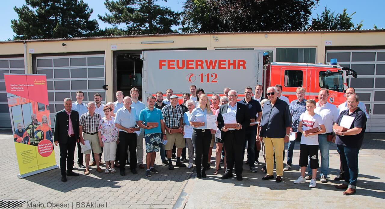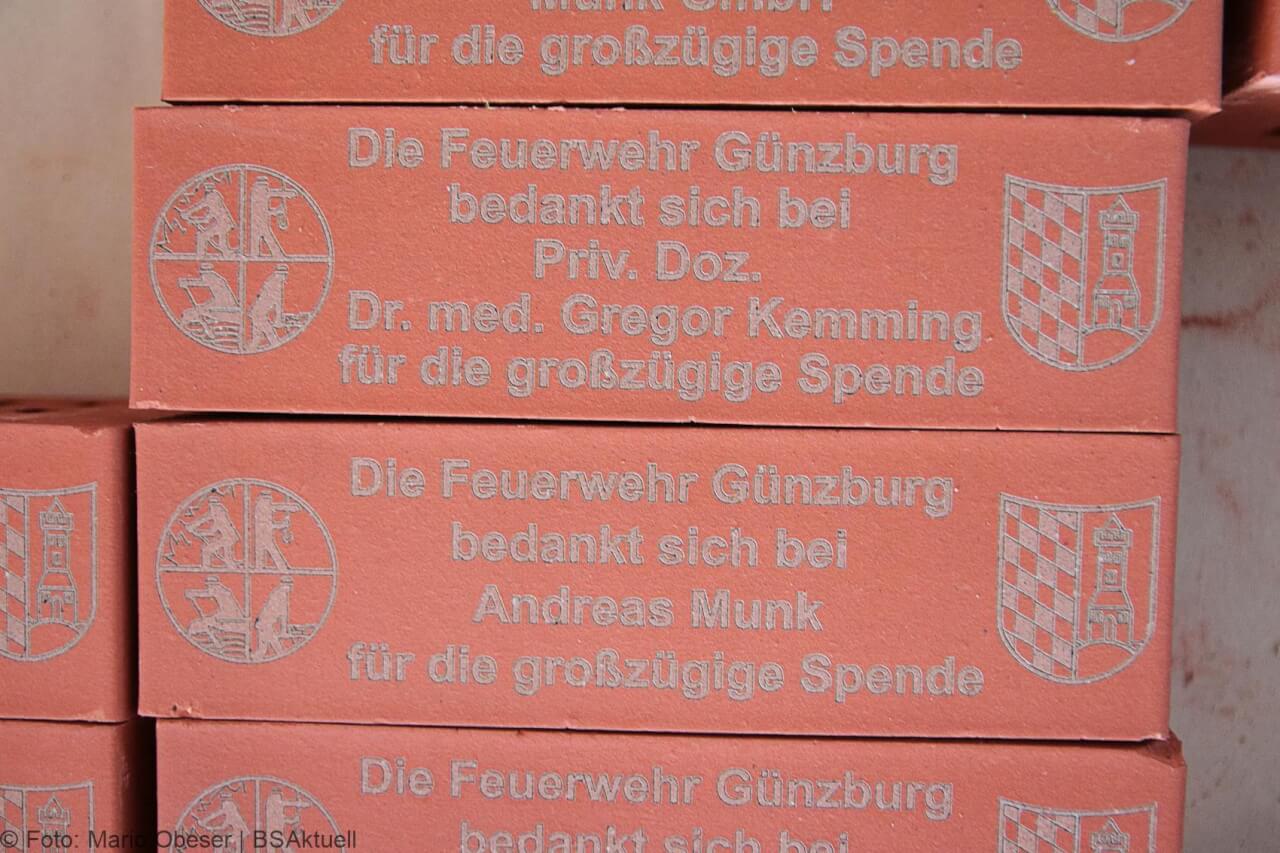 Es gibt auch Räume im neuen Gebäude, welche nicht von der Stadt finanziert werden dürfen. Hierzu zählen u.a. der Jugendraum und das Floriansstüble. Der Feuerwehrverein rief hierzu zu Spenden auf. Hier einzelne Spender namentlich zu hervorzuheben, würde in Anbetracht der zahlreichen Personen und Firmen, die hier Geld beisteuerten, der Sache nicht gerecht werden. Sie erhielten aus den Händen des stellvertretenden Vereinsvorsitzenden Dr. Marc-Michael Venske und seinen Helfern symbolisch einen Ziegelstein, auf dem Dankesworte aufgelasert zu lesen waren. Die Namen werden sich im zukünftigen Gerätehaus auf einer Tafel wiederfinden. So konnten rund 65 Ziegelsteine für großzügige Spenden überreicht werden.