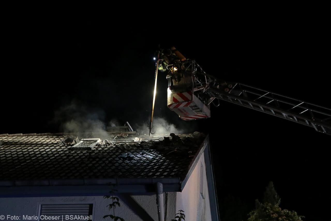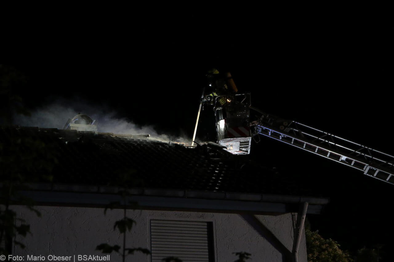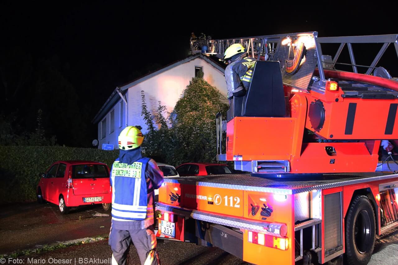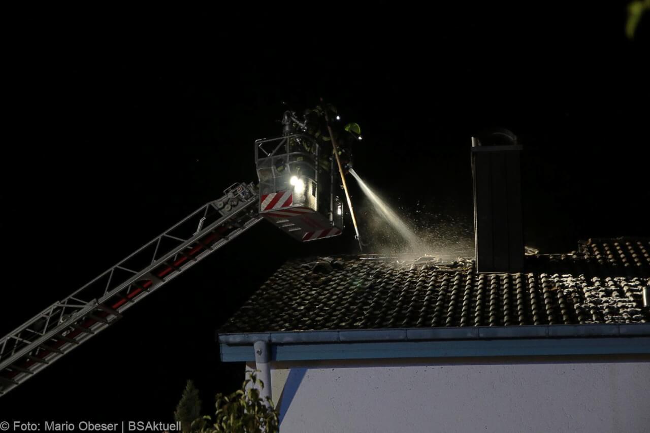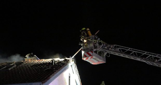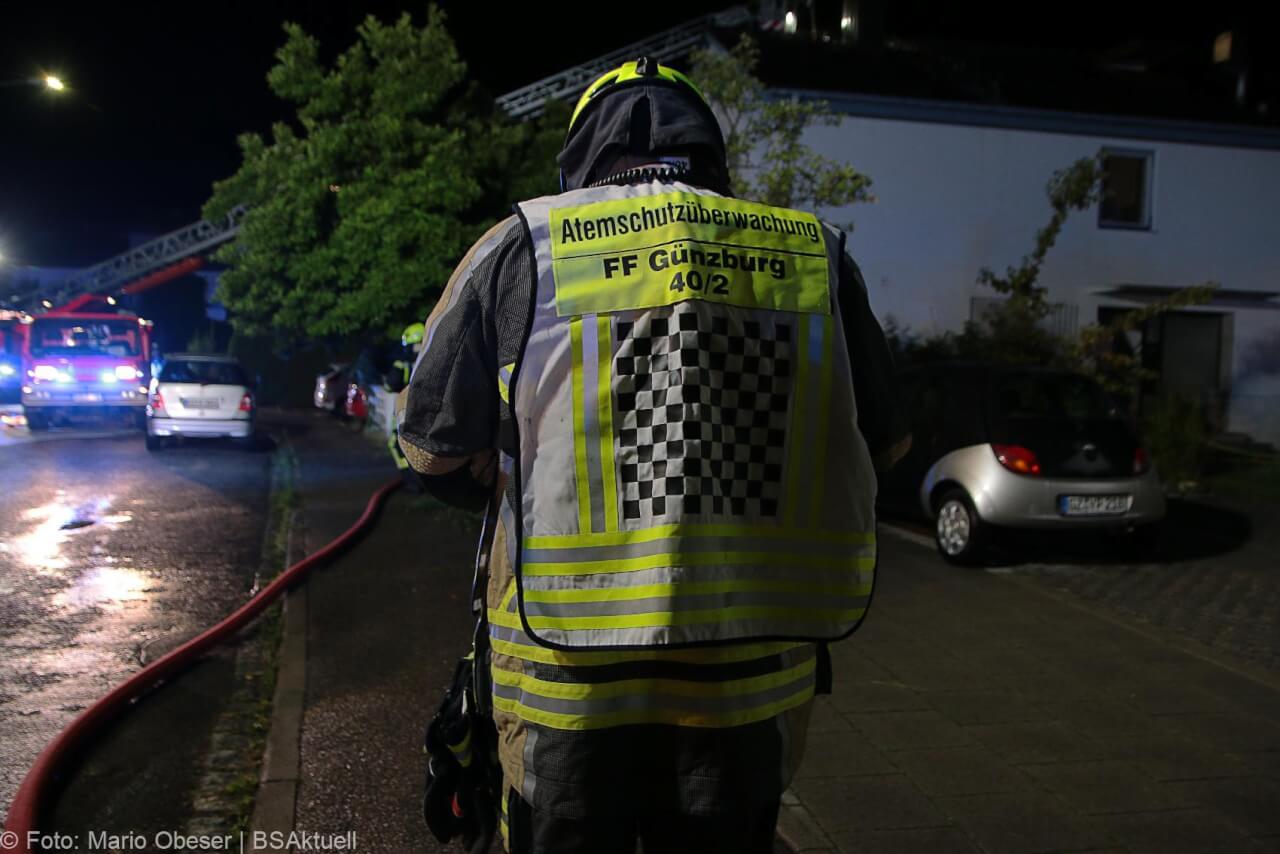 Die 40 Kräfte der Feuerwehr Günzburg brachten die Drehleiter in Stellung und öffneten teilweise das Dach, um Glutnester freizulegen und abzulöschen. Zeitgleich fand ein Löschangriff auch innerhalb des Dachstuhls statt.