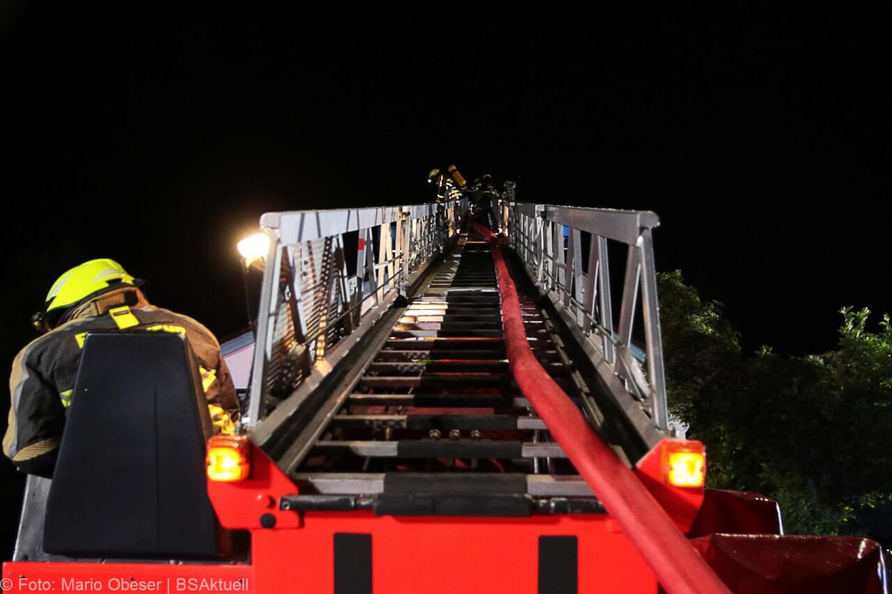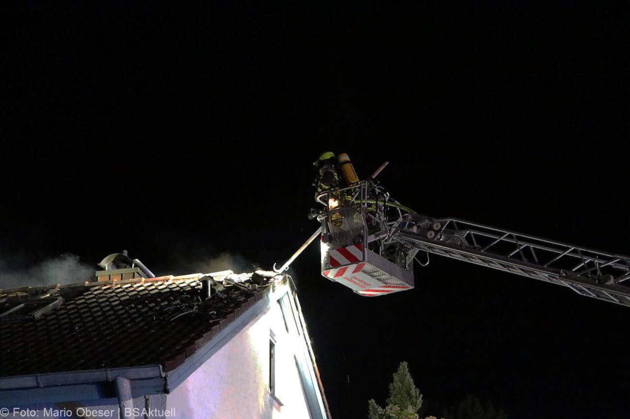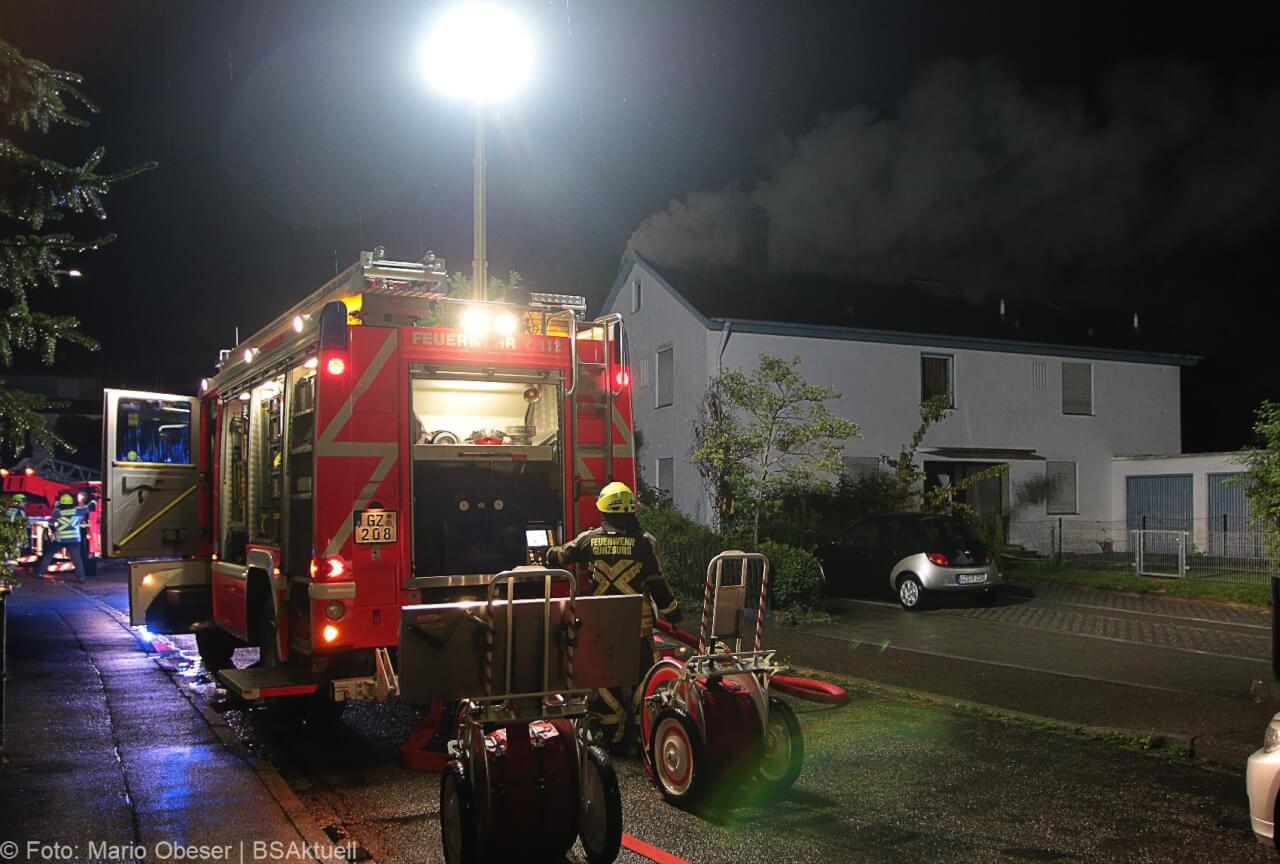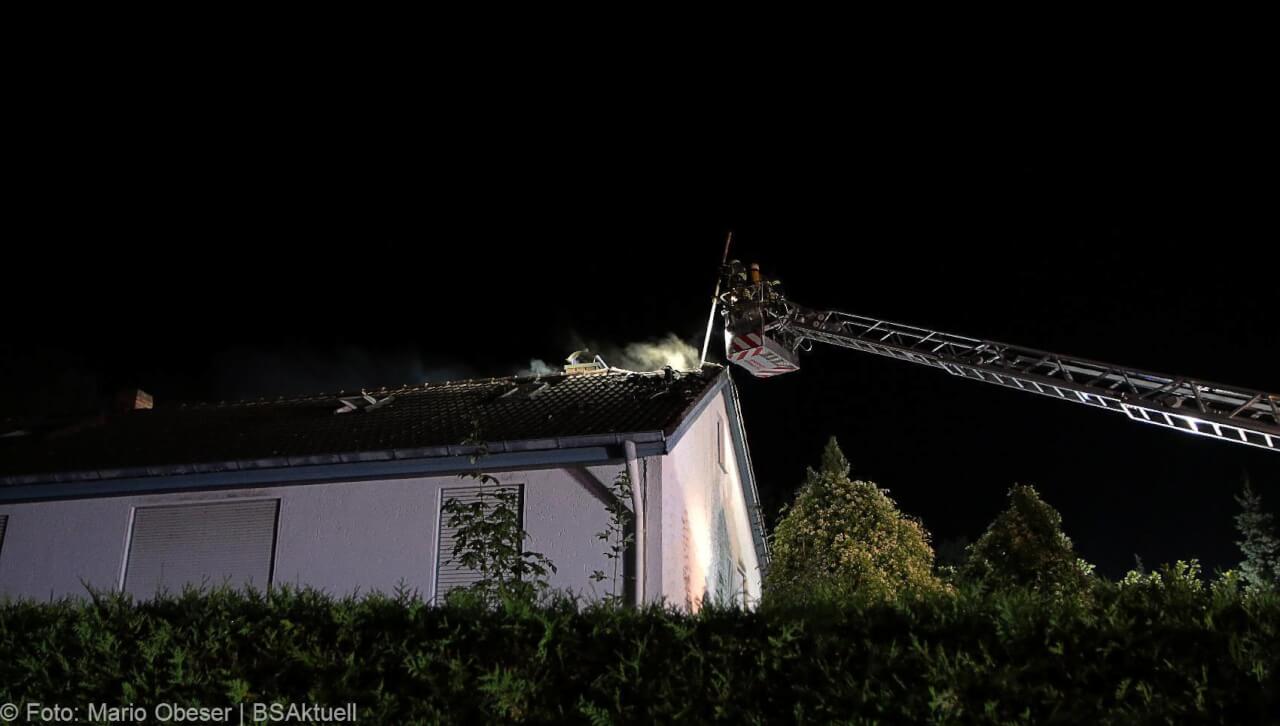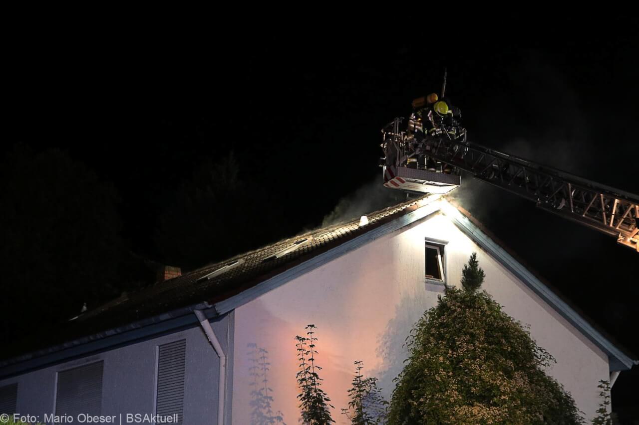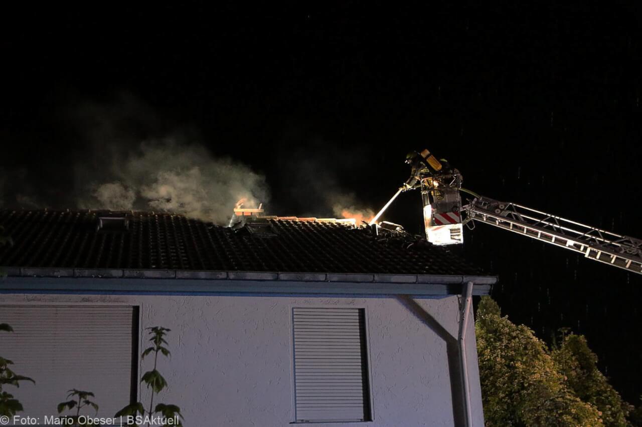 Die 40 Kräfte der Feuerwehr Günzburg brachten die Drehleiter in Stellung und öffneten teilweise das Dach, um Glutnester freizulegen und abzulöschen. Zeitgleich fand ein Löschangriff auch innerhalb des Dachstuhls statt.